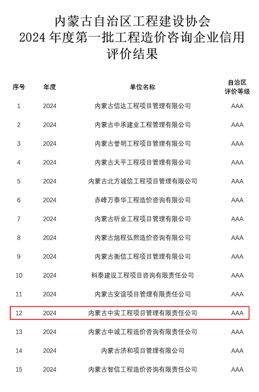 2024-07-3015262 次近期,我公司参加内蒙古自治区工程建设协会组织的“2024年度第一批工程造价咨询企业信用”申报,获得“信用AAA级证书”。我公司成立多年以来,遵循中国工程造价管理协会对造价咨询企…